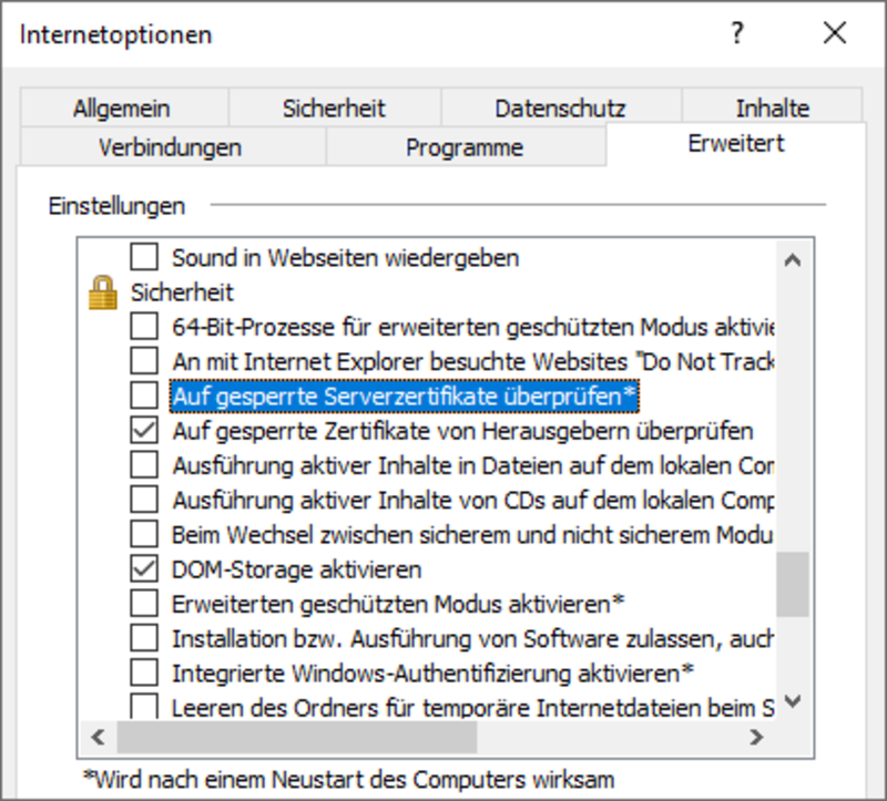 - Deaktivieren Sie außerdem die Optionen „Auf gesperrte Serverzertifikate überprüfen” und „Warnung anzeigen, wenn die Zertifikatadresse nicht übereinstimmt”.