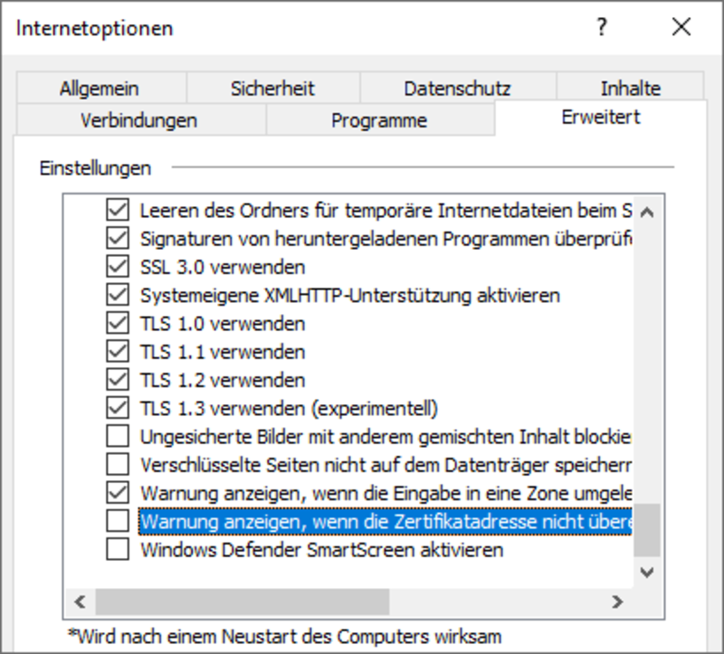 - Aktivieren Sie alle Einträge, die mit „SSL …” und „TLS …” beginnen.