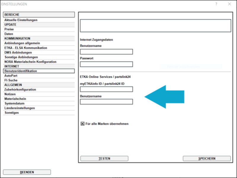 - Prüfen Sie auch hier die ETKA Zugangsdaten in den unteren Feldern mit Klick auf „Testen”.