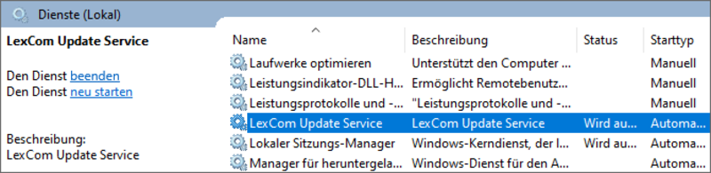 Starten Sie wie folgt den Dienst „LexCom Update Service” neu: