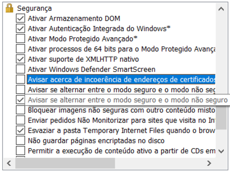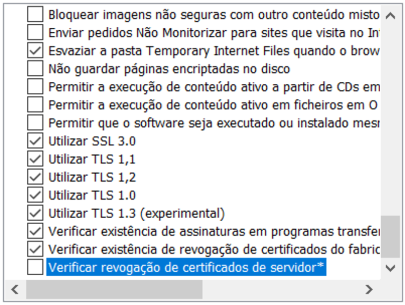 - Desative também as opções "Verificar revogação de certificados de servidor" e "Avisar acerca de incoerência de endereços de certificados".