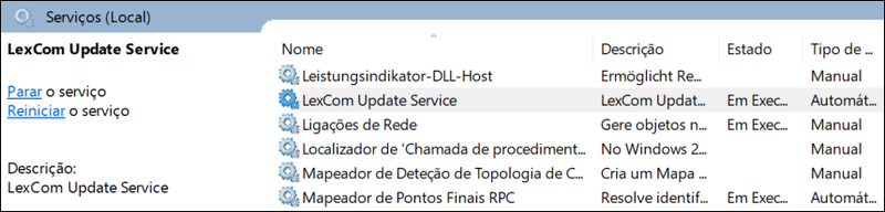 Abre-se uma nova janela com o título "Serviços". - Clique com o botão direito do rato no serviço "LexCom Update Service " e selecione "Reiniciar".
